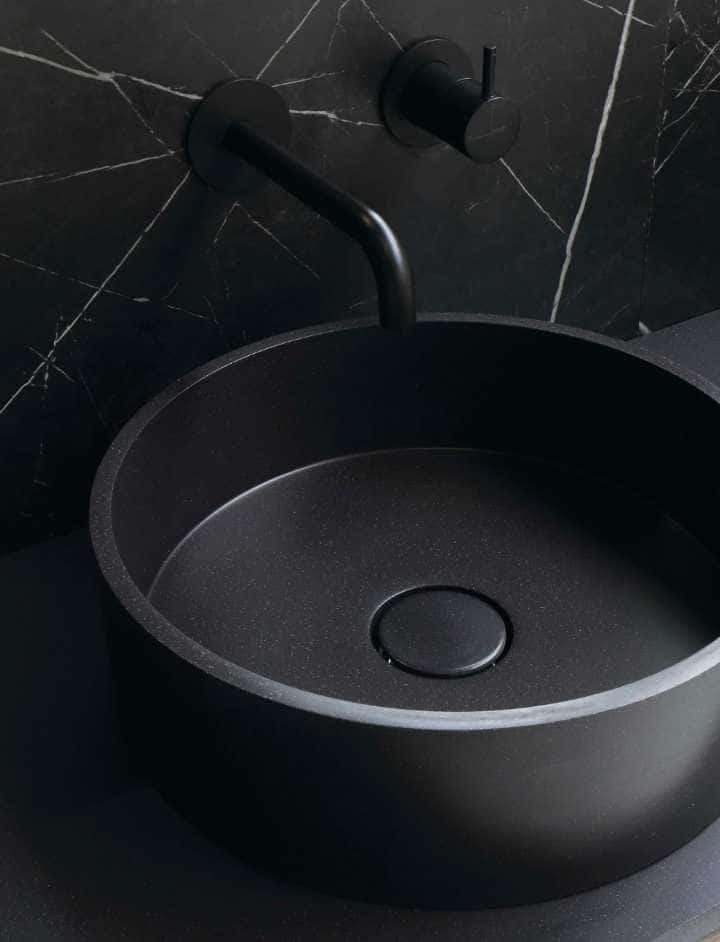 Base units with framed fronts in Nero Assoluto aluminium and Terra di Pompei Laminam Gres In-Side
